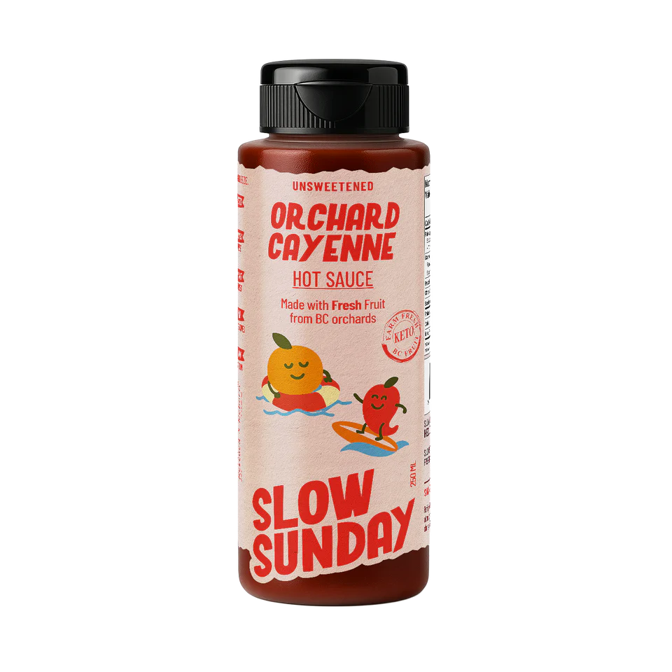 No pastes. No sweeteners. Just farm-fresh fruit cooked with “Sunday” spices into a spicy, squeezable everyday hot sauce.
